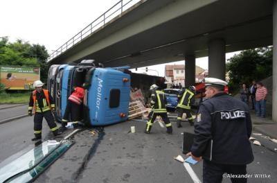 Treysa – Weil ein 57-jähriger LKW Fahrer aus Köln den Ladekran an seinem Fahrzeug nicht vollständig eingefahren hatte, kam es in Schwalmstadt zu einem folgenschweren Verkehrsunfall. Der Mann wollte in der Friedrich Ebert Strasse unter einer Brücke hindurch fahren, doch der ausgestellte Kran blieb an der Brücke hängen, zog den LKW in die Gegenfahrspur und kippte auf die linke Seite.
