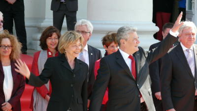 Er wird am Vormittag mit einem offiziellen Akt die dokumenta 13 eröffnen. In den kommenden 100 Tagen also bis zum 16. September 2012 werden dort rund 750.000 Besucher erwartet. Neben Joachim Gauck war auch Ministerpräsident Volker Bouffier und Kulturstaatsminister Bernd Neumann unter den Gästen. Gegen 10 Uhr hatte dann die Warterei ein Ende, schwarze Limousinen mit Blaulicht, geschützt von einer Motorradstaffel zeigten an, hier kommt der Bundespräsident. Nach dem offiziellen Begrüßungszeremoniell und einem freundlichen „Hallo“ an Zuschauer und Vertreter der Presse gab es für die Ehrengäste einen Rundgang zu den wichtigsten Kunstwerken immer unter der fachkundigen Führung von Carolyn Christov-Bakargiev der Leiterin der Dokumenta 13. Umringt von Journalisten und Sicherheitspersonal bahnte sich der Bundespräsident mit Gefolge den Weg in Richtung Orangerie, auch wenn das an machen Stellen zu Problemen führte. Jeder wollte das beste Foto machen, ein Ding der Unmöglichkeit, hier stand sich der eine, oder andere Kollege doch schon selbst im Weg. Etwas schlecht koordiniert der Run ums Bild für Journalisten, stundenlanges Warten auf Dinge die dann doch nicht wie geplant durchgeführt werden konnten, denn wie immer gilt bei Staatsbesuchen die Sicherheit an erster Stelle.. Am Ende kam nach einiger Verwirrung dann doch noch jeder zu seinem gewünschten Bild und nach einem kurzem Fototermin für die Journalisten begab sich der erster Mann im Staat zu Tisch, um dann so schnell wie er gekommen war, auch wieder zu verschwinden.