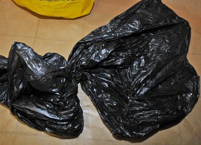 Beim Öffnen des Müllsackes entdeckte er zwei weitere Einkaufsplastiktüten. Darin befand sich das in einem ca. 130 x 70 cm großen Frottee-Badehandtuch eingewickelte tote Neugeborene. Das Motiv auf dem Handtuch stellt eine Meerlandschaft mit orange-weißen Clown-Fischen dar. Bei den Einkaufstüten handelt es sich um eine rot-weiße Tasche des Lebensmittelmarktes Penny und um eine gelbe Tüte mit der blauen Aufschrift des Schuhgeschäftes Galipp.