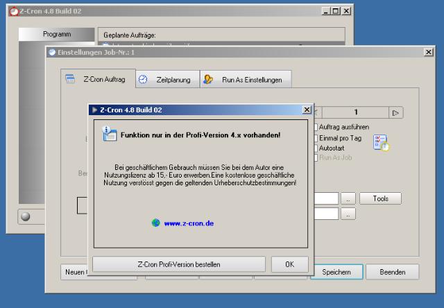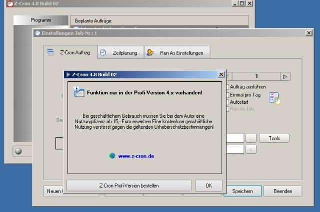 Nachdem wir uns entschieden haben die Software zu kaufen, stellen wir fest, dass bei Zahlung per PayPal, noch einmal 2 Euro Verwaltungs- und Bearbeitungsgebühren anfallen, was bei einem Kauf von Z-Cron für Privatanwender 10% des Kaufpreises ausmacht, einmal ganz davon abgesehen, dass der Link zum Download erst nach Bearbeitung durch den Verkäufer verschickt wird. Darauf haben wir auf Grund der doch recht unregelmäßigen Erreichbarkeit dann doch verzichtet. hn/we