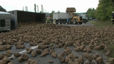 Rund 25 Tonnen Zuckerrüben verteilten sich über die komplette Fahrbahn. Ein eventuell auf die Autobahn abbiegender Verkehrsteilnehmer hätte unter dem LKW begraben werden können. Nach Angaben der Polizei könnte nicht angepasste Fahrweise der Grund für den Unfall sein. Der Fahrer wurde in seinem Fahrzeug nicht eingeklemmt und mit leichten Verletzungen in einem Krankenhaus behandelt. Die rund 25 Tonnen Zuckerrüben die sich auf der Landstrasse verteilten, mussten mittels Radlader in einen zweiten LKW verladen werden. Zunächst jedoch bestand das Problem, dass der angeforderte Bagger nicht über die Ladefläche des LKW ragte und somit ein umladen unmöglich wurde. Nun musste ein zweiter Radlader angefordert werden, der dann die Rüben von der Strasse in den LKW verladen konnte. Die Feuerwehr war mit insgesamt 22 Einsatzkräften vor Ort und musste die Polizei beim Absperren der Strasse unterstützen. Der Verkehr wurde einseitig an der Unfallstelle vorbeigeführt, es kam zu erheblichen Behinderungen. Nach Angaben der Polizei wird der Sachschaden auf rund 50.000 Euro geschätzt.