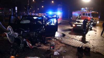 Wiesbaden – Gegen 05:30 Uhr stieß ein Mercedes mit zwei Insassen auf der Kreuzung Äppelallee-Center / A 643 mit einem Kleinbus mit sechs Inassen frontal zusammen. Durch die Wucht des Aufpralls schleuderte der Kleinbus gegen eine Ampelanlage die komplett zerstört wurde. Die gesamte Kreuzung war mit Wrackteilen bedeckt.