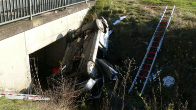 Durch die enorme Wucht wurde das Fahrzeug über ein Brückengeländer geschleudert und kam auf dem Dach zum liegen. Der an der Unfallstelle eingesetzte Notarzt konnte nur noch den Tot der Frau feststellen. Nach ersten Erkenntnissen der Polizei, war die Frau vermutlich nicht angeschnallt. Bei dem Unfall waren keine weiteren Personen oder Fahrzeuge beteiligt. Die L3214 musste auf Grund der Bergungsarbeiten voll gesperrt werden. Neben einem Notarzt waren auch mehrere Rettungswagen im Einsatz. Die Sperrung der Landstasse wurde gegen 13.35 Uhr wieder aufgehoben.