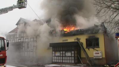 Sofort beginnt die Feuerwehr mit den Löschmaßnahmen. Noch weis niemand, dass eine Zwischendecke über der Diskothek zur Katastrophe führen wird. Überall aus dem Gebäude schlagen die Flammen, die Feuerwehr ist im Dauereinsatz. Nach einem stundenlangen Löscheinsatz beruhigte sich die Lage und nur noch vereinzelnde Glutnester flammten auf die jedoch schnell von den Einsatzkräften gelöscht wurden. Noch während wir mit Einsatzleiter Claus Steinmetz ein Interview führen, ändert sich die Lage gravierend. Aus dem Wohnhaus dring plötzlich schwarzer Rauch aus dem oberen Stockwerk. Minuten später steht fest, das Feuer hat nun auch den Weg in das angrenzende Gebäude gefunden. Wenn es auch zunächst so aussah, als hätte die Feuerwehr die Lage unter Kontrolle, kippt die Situation und das Feuer breitet sich auch in dem Wohnhaus aus. Zunächst hatten die Einsatzkräfte das Haus vom Löschwasser verschonen können. Jetzt hilft nur noch ein massiver Wasserangriff, um schlimmeres zu verhindern. Man muss hier kein Experte sein, diese Bilder sprechen für sich. Das Fachwerkhaus aus dem Jahr 1863 wird wohl diesen Einsatz nicht mehr überleben. Das Wasser strömt in Fluten die Treppe hinunter und erst jetzt wird dem Eigentümer klar, wie schlimm es ihn getroffen hat. Sein Lebenswerk ist zerstört, ebenso wie seine persönliche Habe. Unter Tränen bricht der Mann zusammen, seine Freunde kümmern sich um ihn. Jetzt kommt er zunächst bei seinem Sohn unter. Am frühen Morgen zeigen diese Bilder was der Brand tatsächlich angerichtet hat. Noch immer brennt es auch einem massiven Schaumeinsatz. Übrig geblieben sind nur noch die Grundmauern der Diskothek die 1970 gebaut wurde und zu einem beliebten und nur schwer wegzudenkenden Anlaufpunkt in Wabern geworden ist. Das Wohnhaus hat es schwer getroffen, das Dach ist zerstört, das Wasser im ganzen Haus verteilt. Die Polizei hat die Ermittlungen noch am Morgen aufgenommen. Der DRK Versorgungszug aus Gudensberg kümmert sich um die Verpflegung der rund 150 Einsatzkräfte. Auch Rainer Häßler Freund und Nachbar des Geschädigten versorgte die Helfer vor Ort mit heißen Getränken. Erst nach knapp 12 Stunden galt der Einsatz als offiziell beendet. Nach vorsichtigen Schätzungen liegt des Sachschaden bei rund 250.000 Euro. Jetzt bleibt nur noch abzuwarten, was den verheerenden Brand ausgelöst hat.