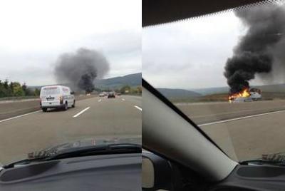 Beim Eintreffen der ersten Einsatzkräfte stand das PKW-Gespann im Vollbrand. Für die Löscharbeiten musste die A7 zeitweise in Fahrtrichtung Norden voll gesperrt werden. Der Sachschaden wird auf mehr als 50.000 Euro geschätzt, die Ursache ist unklar.
