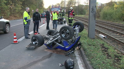 Kurz nach der Unterführung der A44 kam der Fahrer aus bisher nicht geklärter Ursache auf den Seitenstreifen, fuhr gegen ein Straßenschild und wurde in das parallel verlaufenden Straßenbahn Gleisbett geschleudert. Trotz eines Helms wurde der Mann so schwer am Kopf verletzt, dass er noch an der Unfallstelle verstarb. Zur Klärung der Unfallursache wurde von der Staatsanwaltschaft Kassel ein Gutachter zur Unfallstelle bestellt. Während der Bergungsmaßnahmen kam es zu erheblichen Behinderungen. Die Feuerwehr Baunatal war zur Unterstützung der Einsatzkräfte und zur Verkehrsabsicherung im Einsatz. Der Straßenbahnverkehr wurde durch Ersatzbusse geregelt, da die Bahnstrecke gesperrt werden musste. Nach Angaben der Polizei wird der Sachschaden auf ca. 6000.- Euro geschätzt.