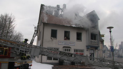 Gegen 01.17 Uhr brach das Feuer in der Bahnhofstrasse unter einer angrenzenden Überdachung aus. In der Nacht musste eine 78-jährige Frau mit der Drehleiter aus dem Haus gerettet werden, Minuten später schlagen dichte Flammen aus dem Dachgeschoss. Heute ein Tag nach dem Brand ist die Frau wieder auf dem Weg der Besserung. Für die Inhaber der betroffenen Geschäfte ein Desaster, wenn nicht durch den Brand vernichtet, wurde das Inventar und die Waren durch Löschwasser unbrauchbar gemacht. In wie weit die Versicherungen nachher für den Schaden aufkommen werden vermag noch niemand zu sagen. Anwohner sind geschockt über den Anblick am Tag danach. Jeder weis wie lebenswichtig Brandmelder sein können. Bei diesem Brand konnte die Feuerwehr keinen Melder entdecken. Dennoch nicht jeder verzichtet auf diese Anschaffung, denn im Zweifel können diese Geräte Leben retten. Rund 60 Feuerwehrleute waren am Tag noch einmal im Einsatz, um die noch bestehenden Glutnester zu bekämpfen. Auch wenn die Feuerwehr eine Brandstiftung in Erwägung zieht, konnte die Polizei jedoch noch nicht bestätigen. Noch sind die Ermittlungen nicht abgeschlossen, auch das Landeskriminalamt wurde in die Ermittlungen einbezogen.