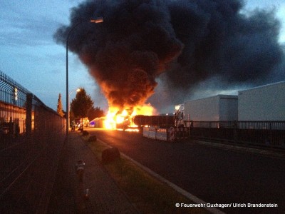 Guxhagen – Guxhagen – Am frühen Sonntagmorgen gegen 5 Uhr kam es in Guxhagen auf einem Speditionsgelände zum Brand mehrerer LKW. Als die Feuerwehr an der Einsatzstelle eintraf, standen bereits vier Tanklastzüge in Vollbrand. Ein fünfter LKW konnte noch aus dem Gefahrenbereich gebracht werden, sodass dieser nur leicht beschädigt wurde.