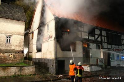 Immichenhain – Aus ungeklärter Ursache kam es am frühen Morgen gegen 6 Uhr zum Brand in der ehemaligen „Musikkneipe Between“. Der Brand wurde von einem Anwohner bei der Feuerwehr gemeldet. Mehrere Ortsfeuerwehren rückten mit insgesamt 64 Einsatzkräften an, um den Brand zu bekämpfen. Das Fachwerkhaus stand bei Eintreffen der Feuerwehr bereits in Vollbrand.