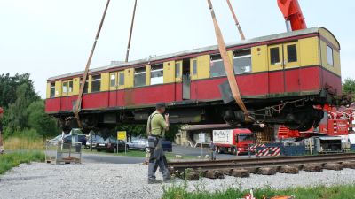 Wolfhagen – Ein Original Waggon der BVG ( Berliner Verkehrs Gesellschaft) steht seit Freitag auf dem Gelände der Matratzen Union in Wolfhagen im Sandweg 1. An frühen Morgen wurde der rund 28 Tonnen schwere S-Bahn Waggon vom Tieflader auf eine Schiene vor der Zweigstelle in Wolfhagen abgestellt.