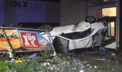 Anschließend beschädigte er mit seinem Pkw auf einer Länge von 25 Metern mehrere Werbeschilder und Blumenrabatten, ehe er schließlich gegen das Kassenhäuschen des Schnellrestaurants prallte und auf der Seite liegen blieb. Der Fahrer des Unfallfahrzeugs flüchtete anschließend zu Fuß von der Unfallstelle. Ein Zeuge konnte beobachten, wie der Mann offenbar von einem an der Unfallstelle haltenden dunklen Pkw mitgenommen wurde. Die Fahndung nach dem Unfallflüchtigen verlief bislang ergebnislos. Das Schnellrestaurant war zur Unfallzeit geschlossen, lediglich Reinigungskräfte waren noch anwesend, so dass sonst keine Personen verletzt wurden.Es entstand Sachschaden in Höhe von insgesamt ca. 12.500,- Euro.Zeugen, die Angaben zur Identität und zum Aufenthalt des Unfallfahrers machen können, werden gebeten, sich mit dem Polizeirevier Süd-West in Baunatal unter Tel.: 0561-9102620 in Verbindung zu setzen.