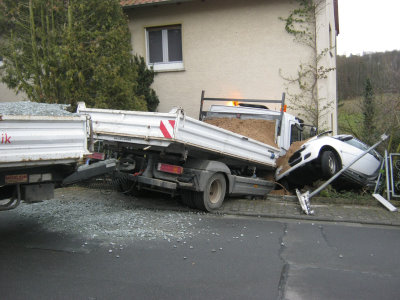 Südhessen / Modautal – In der Küche eines Wohnhauses in der Brückenstraße kam ein Lastwagen mit Anhänger am Montagvormittag zum Stehen, nachdem er sich verselbständigt hatte. Das mit vier Tonnen Kies und Sand beladene und geparkte Fahrzeug setzte sich gegen 08.40 Uhr aus bislang ungeklärter Ursache in Bewegung und rollte die abschüssige Brückenstraße hinunter.