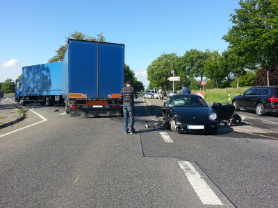 Wiesbaden – Am Freitag kam es gegen 9 Uhr auf der B 455 an der Einmündung New-York-Straße zu einem Verkehrsunfall zwischen einem LKW und einem Porsche, bei dem der Porsche-Fahrer leicht verletzt wurde.
