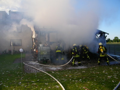 Bereits auf der Anfahrt konnte von den Einsatzkräften eine große Rauchsäule gesehen werden. Bei Ankunft an der Einsatzstelle stand eine Garage mit angebauten Schuppen im Vollbrand. Mit zwei C-Rohren konnte die Feuerwehr das Feuer schnell löschen. Anschließend wurde der Schutt auseinander gezogen und restliche Glutnester abgelöscht. Gegen 21:30 Uhr war der Einsatz beendet. Der Sachschaden wird auf rund 30.000 Euro geschätzt. Die Brandursache ist noch unklar, die Polizei hat die Ermittlungen aufgenommen.