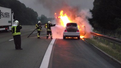 völlig ausbrannte, waren doch die meisten Feuerwehrleute nach dem Fußballspiel Deutschland gegen Portugal noch im Gerätehaus, wo sie sich das Spiel gemeinsam angesehen haben. Aber der BMW brannte so schnell in ganzer Ausdehnung, dass auch die schnellste Feuerwehr nichts mehr hätte retten können. Dicker schwarzer Rauch stieg über der Einsatzstelle auf und behinderte teilweise den Verkehr. Während der Löscharbeiten knallte es mehrfach, als die Reifen des Fahrzeugs platzten. Beim ersten Löschangriff unter Atemschutz wechselte der Rauch dann in weiß über und stieg als eine fast undurchdringliche Wand in den Abendhimmel. Wie es zum Fahrzeugbrand kommen konnte ist zurzeit noch unklar. Fest steht nur, dass am BMW ein Totalschaden entstand. Während der Löscharbeiten mussten der rechte und der mittlere von drei Fahrstreifen gesperrt werden. Aufgrund des geringen Fahrzeugaufkommens kam es jedoch zu keinen nennenswerten Behinderungen.