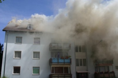 Unter den Dachziegeln breitete sich das Feuer auf einer Länge von rund 40 Metern aus. Die Bewohnerin der Brandwohnung konnte sich in die Nachbarwohnung retten und wurde anschließend vom Rettungsdienst versorgt. Sie wurde in ein Krankenhaus gebracht. Zwei weitere Personen wurden mit Verdacht auf Rauchgasvergiftung vor Ort ambulant behandelt. Zur Bekämpfung des Brandes wurden vier Drehleitern eingesetzt. Zum Ablöschen der Glutnester mussten der Dachstuhl geöffnet werden. Das Feuer war um kurz nach 17 Uhr unter Kontrolle. Während der Löscharbeiten mussten die rund 70 Bewohner das Gebäude vorsichtshalber verlassen. Zwei Wohnungen sind vorübergehend nicht bewohnbar. Die vier Bewohner wurden deshalb in Hotels untergebracht. Im Einsatz waren rund 100 Einsatzkräfte der Berufsfeuerwehr, Freiwilliger Feuerwehr und des Rettungsdienstes. Gegen 21 Uhr war der Einsatz beendet. Der Sachschaden wird auf eine halbe Million Euro geschätzt. Die Polizei hat die Ermittlungen zur Brandursache aufgenommen.