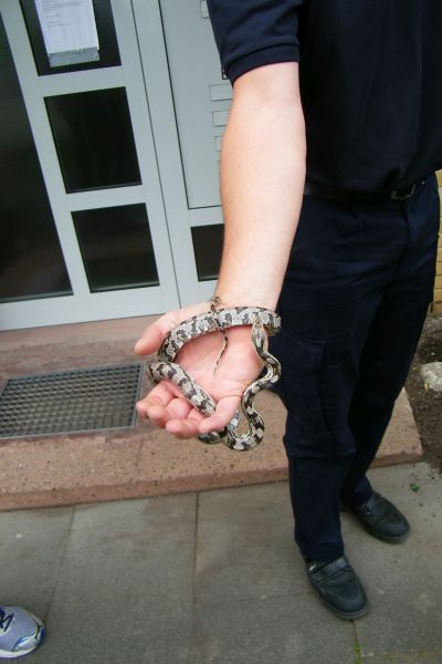 Ein Beamter der Berufsfeuerwehr, der privat Schlangen und anderer Reptilien züchtet, rückte daraufhin nach Wehlheiden aus. Vor Ort wurde eine etwa 90 cm lange Kornnatter vorgefunden. Die ungiftige Schlange, die hierzulande nicht heimisch ist, muss offensichtlich ihrem Besitzer entwischt sein. Ein Reptilienhalter konnte im näheren Umkreis jedoch nicht ermittelt werden. Daher wurde das Tier vorübergehend von dem fachkundigen Feuerwehrbeamten in Obhut genommen. Der Besitzer wird gebeten sich mit der Feuerwehr Kassel in Verbindung zu setzen, um den Ausreißer wieder entgegen zu nehmen.