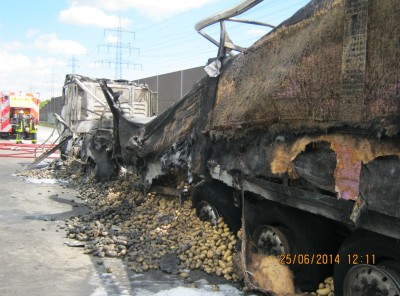 Nach rund 20 Minuten konnte die Feuerwehr das Feuer unter Kontrolle bringen. Der mit 26 Tonnen Kartoffeln beladene Lkw brannte vollständig aus. Unglücklicherweise hielt der Fahrer direkt neben einem auf der Standspur stehenden Lkw, der eine Reifenpanne hatte. Dieser wurde durch den Brand ebenfalls beschädigt. Für die Löscharbeiten musste die Autobahn in Richtung Norden bis 12 Uhr voll gesperrt werden. Die Aufräumarbeiten zogen sich mehrere Stunden lang. Die rechte Fahrspur bleibt weiterhin gesperrt, da die Fahrbahndecke beschädigt wurde. Die Höhe des Sachschadens ist unbekannt.