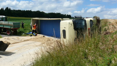 Der Fahrer wurde leicht verletzt und mit einen Schock in ein Krankenhaus eingeliefert. Die Feuerwehr aus Rhoden, Diemelstadt und Dehausen waren im Einsatz um Betriebsstoffe aufzunehmen und den Sand zu entfernen. Ein Landwirt half die Feuerwehr mit seinem Traktor. Die Landesstraße zwischen Dehausen und Roden blieb bis 18 Uhr voll gesperrt.