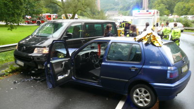 Im PKW des 29-Jährigen waren zwei Kinder im Alter von acht und zehn Jahren. Alle Insassen wurde leicht verletzt und nach einer Erstversorgung an der Unfallstelle in ein Krankenhaus nach Kassel eingeliefert. Der Fahrer des VW-Busses blieb unverletzt. Der Sachschaden wird auf rund 7.500 Euro geschätzt. Im Einsatz war auch die Feuerwehr aus Hann. Münden und Hedemünden, sie nahmen auslaufende Betriebsstoffe auf und sicherten die Strecke ab.