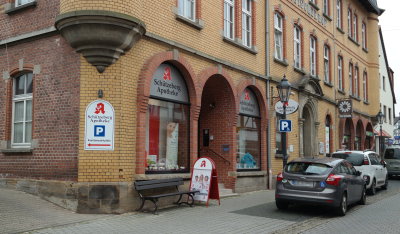 Nachdem der Täter die Beute in einen mitgeführten schwarzen Rucksack gepackt hatte, verließ er die Apotheke durch die Eingangstür und flüchtete zu Fuß in Richtung Ortsmitte, Rathaus.