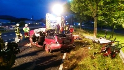 In Höhe der Polizeistation kam das mit vermutlich erheblich überhöhter Geschwindigkeit fahrende Fahrzeug nach links von der Fahrbahn ab, touchierte die dort befindliche Schutzplanke, wurde von dort abgewiesen und schleuderte über einen Grünstreifen zurück auf die Richtungsfahrbahn Niederaula. Im weiteren Verlauf krachte der VW gegen die rechte Schutzplanke, die sich etwa um 3 Meter nach außen verformte und prallte mit der Schutzplanke gegen einen Baum. Bei dem Unfall wurden der Fahrer und der Beifahrer, der heute 18 Jahre alt wurde, im Fahrzeug schwerst eingeklemmt und verstarben noch an der Unfallstelle. Die Alarmierte Feuerwehr aus Bad Hersfeld musste erst das Fahrzeug vom Baum ziehen, bevor die Toten aus dem Fahrzeugwrack geborgen werden konnten. Während der Bergungsarbeiten wurde der Verkehr im Wechsel an der Unfallstelle vorbei geführt. Wie die Polizei später mitteilte, waren Fahrer und Beifahrer nicht angeschnallt.