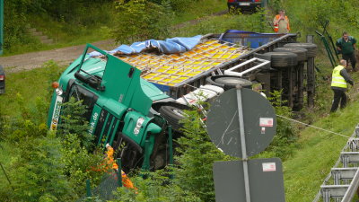 Das Fahrzeug blieb in einer Böschung über einem Wasserdurchlauf liegen. Der Fahrer wurde bei dem Unfall leicht verletzt und in ein Krankenhaus eingeliefert, welches er bereits wieder verlassen konnte. Der LKW hatte rund 7500 Masthühner geladen die in Plastikboxen transportiert wurden. Zunächst musste die Autobahn in Richtung Kassel für den Verkehr komplett gesperrt werden, vor allem auch die Ausfahrt Rasthof Bühleck. Das Transportunternehmen des Unfallfahrers forderte zunächst einen zweiten LKW an, um die Tiere umladen zu können. Über einen Privatweg der parallel zur Autobahn verläuft wurde dieser in Stellung gebracht. Ein Bergungsunternehmen aus Kassel brachte einen von der Autobahnseite aus einen Kran in Stellung und hob die Gestelle mit den Transportboxen aus dem verunfallten LKW heraus. Mit einem Radlader wurden dann die Boxen verladen. Viele Hühner werden den Unfall wohl nicht unbeschadet überstanden haben. Ein Veterinär war bereits vor Ort und hat die Tiere begutachte. Wie uns ein Sprecher der Feuerwehr Breuna mitteilte werden die Tiere nach der Bergung in einem nahe gelegenen Schlachthof von Ihrem Leiden erlöst. Wie es zu dem Unfall kommen konnte, steht derzeit noch nicht fest. der Sachschaden wird von der Polizei auf rund 120.000 Euro geschätzt. Im Einsatz war die Feuerwehr Breuna mit insgesamt 25 Einsatzkräften. Die Autobahnmeisterei kümmerte sich um die Absperrmaßnahmen an der Unfallstelle und an der Auffahrt Breuna in Richtung Kassel. Durch den Unfall kam es auf der A44 zu kilometerlangen Staus. Der Verkehr wurde ab der Anschlussstelle Breuna von der Autobahn abgeleitet. Auf Grund der sehr aufwendigen Bergungsmaßnahmen konnte die Sperrung der Autobahn erst gegen 15.45 Uhr wieder aufgehoben werden.