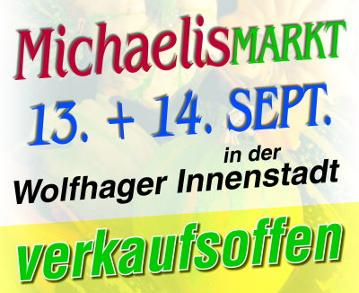 Am 13. & 14.September ist es wieder soweit und die Wolfhager feiern ihren traditionellen Michaelismarkt. Verkaufsoffen Auch in diesem Jahr werden die Innenstadtgeschäfte wieder ihr vielfältiges und interessantes Angebot zur Schau stellen und neben den neuen Herbst-/Wintertrends auch speziell zum Michaelismarkt tolle Angebote präsentieren.