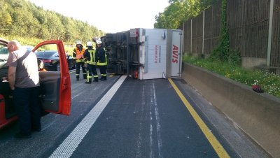 Beim Versuch, das Fahrzeug wieder auf die Fahrbahn zu bekommen, schaukelte sich der LKW auf und kippte nach rechts auf die Beifahrerseite, wo er zwei von drei Fahrspuren blockierte. Autofahrer, die sofort zu Unfallstelle eilten, zerschlugen die Frontscheibe. Die Fahrerin kam nach der Erstversorgung mit dem Rettungswagen in ein Krankenhaus. Feuerwehrfahrzeuge und der Rettungsdienst hatten erhebliche Probleme zur Unfallstelle zu gelangen, da die Autofahrer nicht in der Lage waren, eine passierbare Rettungsgasse zu bilden und so benötigte die Feuerwehr von der Anschlussstelle Homberg Efze bis zur nur einen Kilometer entfernten Unfallstelle fast 25 Minuten. Hochspannung bei den Rettern, da sie in ihrer ersten Alarmierung zu einem Unfall mit eingeklemmter Person gerufen wurden, was sich jedoch zum Glück nicht bestätigte. Während der Rettungsarbeiten und während der Bergung des mit Umzugsgut beladenen LKWs wurde eine Vollsperrung der Richtungsfahrbahn Süd eingerichtet. Der Verkehr, der ab Homberg Efze umgeleitet wurde, staute sich über mehrere Kilometer bis fast nach Malsfeld zurück. Über die Höhe des Sachschadens konnten noch keine Angaben gemacht werden.
