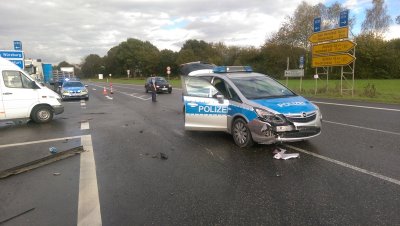 Eine Autofahrerin befuhr die Bundesstraße in entgegen gesetzter Fahrtrichtung und wollte nach links auf die Autobahn abbiegen. Hierbei übersah die Opelfahrerin den entgegenkommenden und vorfahrtberechtigten Streifenwagen. Der Polizeibeamte konnte nicht mehr rechtzeitig bremsen und krachte mit dem Streifenwagen in die Beifahrerseite des Opels. Durch den Aufprall wurde der Opel noch gegen einen Kleintransporter geschleudert, der von der Autobahn auf die Bundesstraße abbiegen wollte. Bei dem Unfall wurde die Fahrerin des Opels und der Fahrer des Kleintransporters verletzt und mit Rettungswagen in ein Krankenhaus gefahren. Die beiden Beamten des Streifenwagens blieben bei dem Unfall unverletzt. An allen drei Fahrzeugen entstand erheblicher Sachschaden. Während der Rettungs- und Bergungsarbeiten kam es auf der Abfahrt von der A7 und auf der Bundesstraße, wo der Verkehr einspurig an der Unfallstelle vorbei geführt wurde, zu erheblichen Behinderungen.