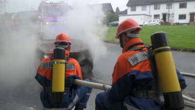 Starke Rauchentwicklung in einer Lagerhalle, zwei Personen (Puppen) vermisst, 3 Trupps unter JF-Atemschutzattrappen, Personensuche und -rettung von 2 Trupps, 1 Trupp Einleitung der Brandbekämpfung. zwei Trupps Aussenangriff vorbereiten, 1 Trupp Druckbelüfter in Stellung bringen. Beide Personen wurden nach kurzer Zeit gefunden und an das JRK übergeben, dieses hatte bei einer angenommen, das es sich dabei um eine Rauchgasintoxikation handeln und eine Puppe musste reanimiert werden.