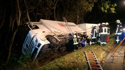 Der Absturz wurde von Bäumen abgebremst, wobei der Lastzug und Anhänger nach rechts wegkippte. Der Fahrer und sein Beifahrer(28), beide aus Rumänien, konnten die zwischen Bäumen eingeklemmte Zugmaschine aus eigener Kraft und unverletzt verlassen. Zur Bergung des Lastzuges musste zuerst die Feuerwehr aus Bad Hersfeld zur Einsatzstelle ausrücken, um die Bäume, zwischen denen das Gespann eingeklemmt war, zu fällen. Gleichzeitig mussten die Kraftstofftanks der Zugmaschine leergepumpt werden um eine Umweltverschmutzung während der Bergung zu verhindern. Zur Bergung des Gespanns musste zuerst die mit drei Tonnen beladene Zugmaschine vom Anhänger getrennt werden, bevor die Zugmaschine mit Hilfe von zwei Bergefahrzeugen wieder aufgerichtet und auf die Fahrbahn gezogen werden konnte. Während der Bergungsarbeiten musste die A4 in Fahrtrichtung Kirchheim voll gesperrt werden. Der Verkehr wurde bereits in Hönebach von der Autobahn abgeleitet und in Bad Hersfeld der A4 wieder zugeführt. Auf der Umleitungsstrecke kam es bereits in den frühen Morgenstunden zu erheblichen Behinderungen und einem Stau von mehreren Kilometern Länge. Die Höhe des Sachschadens wird von der Polizei mit ca. 72.000 Euro beziffert.