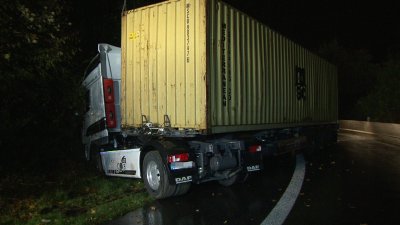 Kassel – Auf der Verbindung von der A44 auf die A49 von Dortmund kommend, kam es gegen 20 Uhr zu einem Unfall mit einem LKW. Vermutlich auf Grund der starken Regenfälle kam ein Sattelzug in der Kurve nach rechts von der Fahrbahn ab und knickte komplett ein.