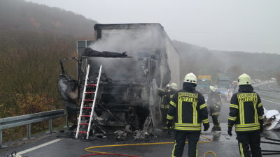 Der Mann konnte sich und seine privaten Sachen in Sicherheit bringen, dann stand das Fahrerhaus auch schon in Flammen. Ein großes Problem stellte die Ladung dar, denn es handelte sich um Paletten mit Papier. Beim Eintreffen Feuerwehr hatte das Feuer bereits auf die Ladung übergegriffen, konnte jedoch sehr schnell unter Kontrolle gebracht und somit Schlimmeres verhindert werden Eine weitere Aufgabe der Feuerwehr bestand darin Diesel und Öl welche über beide Fahrbahnen gelaufen waren unter Kontrolle zu bringen. Mit Bindemittel konnte zunächst verhindert werden, dass Schadstoffe in die Kanalisation gelangen konnten. Mitarbeiter der Autobahnmeisterei Gudensberg und die untere Wasserbehörde prüften alles im Detail, konnten jedoch zumindest für die Umwelt Entwarnung geben. Etwas anders sieht es derzeit für die Fahrbahn aus.