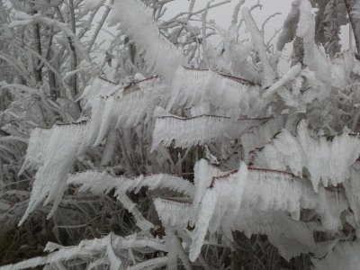 Aus der tristen grün/grauen Landschaft wird schon nach wenigen Kilometern eine weiße Traumlandschaft. Bei -3 Grad und starkem Wind hat sich ein Panzer aus Schnee und Eis auf den Bäumen, Gräsern und Büschen gebildet. Die Äste wurden durch Eislast nach unten gedrückt und drohten teilweise zu brechen. Die Verkehrsschilder und Leitpfosten wurden mit Eis überzogen. Auf der Straße bildete sich ein Raureif. Jetzt fehlt nur noch strahlender Sonnenschein um das Wintermärchen perfekt zu machen. Wer das kalte Wetter nicht scheut für den lohnt sich ein Ausflug in die Eisenberger Eislandschaft.