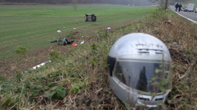 Eine 23-jährige Frau musste Ihr Fahrzeug abbremsen um nicht mit dem entgegenkommenden Fahrzeug zusammenzustoßen. Hierbei verlor Sie die Kontrolle über Ihr Fahrzeug und stieß mit dem Rollerfahrer zusammen.Die Frau stürzte mit Ihrem Fahrzeug eine Böschung hinab überschlug sich mehrfach und bleib dann auf der Seite in einem Feld liegen. Auch der Rollerfahrer wurde mitgerissen und kam auf dem Feld schwer verletzt zum liegen. Nach einer notärztlichen Erstversorgung an der Unfallstelle wurde die Frau mit einem Rettungswagen in ein Krankenhaus eingeliefert. Der schwer verletzte Rollerfahrer, dessen Identität noch nicht fest steht, wurde mit dem Rettungshubschrauber in eine Klinik geflogen.Der Unfallverursacher fuhr weiter, ohne sich um die Verletzten zu kümmern. Es muss nun geklärt werden, ob der Fahrer des Kleinwagens den Unfall auch nicht bemerkt haben kann. Um nun den genauen Unfallhergang klären zu können, wurde von der Staatsanwaltschaft ein Gutachter zur Unfallstelle bestellt. Die L3212 musste teilweise voll gesperrt werden. Über die Höhe des Sachschadens konnte die Polizei noch keine Angaben machen.