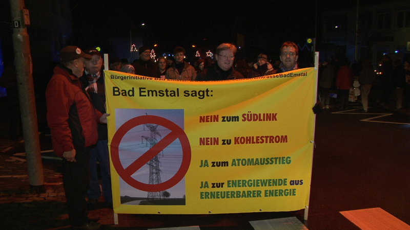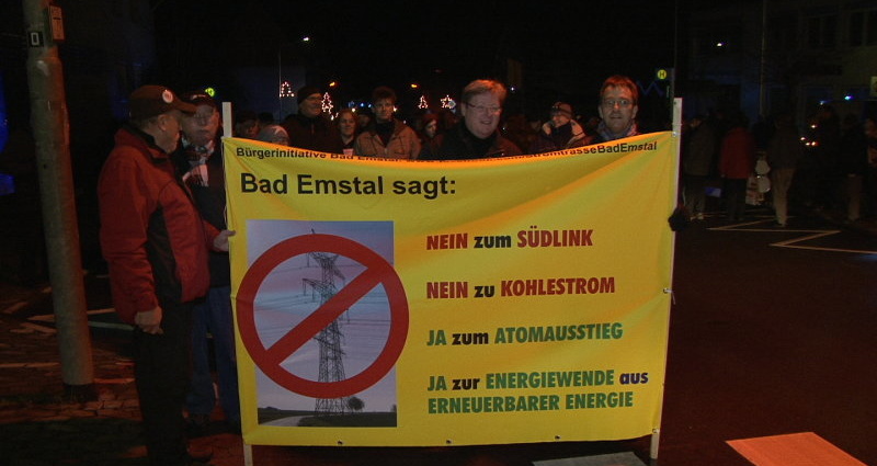 Bad Emstal – Rund 500 Menschen haben am Montagabend gegen die geplante Stromtrasse Suedlink protestiert. Die Protestler trafen sich vor dem Rathaus und bewegten sich geschlossen bis zu Edeka Markt am Ortsausgang und wieder zurück.