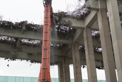 Melsungen – Der Abriss der Helterbachtalbrücke an der A7 hat begonnen. Hier noch Bilder aus vergangenen Tagen, also die Brücke noch voll in Betrieb war. Mit einem ZX870, einem großen tonnenschweren Bagger und einer sechs Tonnen schweren Schere werden Betonteile bis 80cm in mühsamer Kleinarbeit abgetragen.