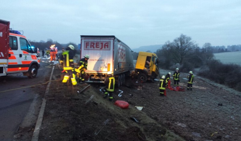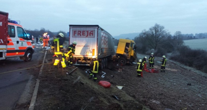 Kirchheim – Zu einem schweren Verkehrsunfall mit einem LKW kam es am frühen Montagmorgen auf der A7 zwischen den Anschlussstellen Bad Hersfeld West und dem Kirchheimer Dreieck. Aus bisher noch nicht geklärter Ursache kam der Fahrer eines Sattelzuges nach rechts von der Fahrbahn ab walzte mehrere Meter Leitblank um fuhr eine Böschung hinunter und kam dann auf einem Acker zum stehen.
