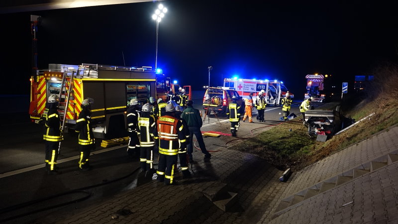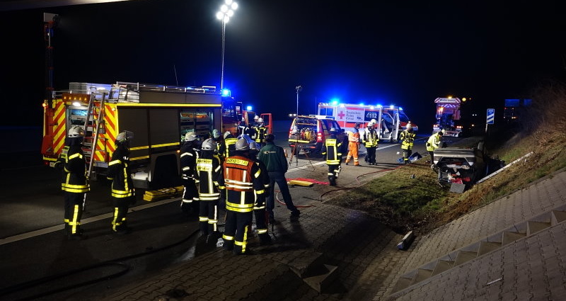 Bei Ankunft der Feuerwehr Hofheim war der Fahrer im Fahrzeug eingeklemmt. Rund 30 Minuten hat die Rettung des Fahrers gedauert bis er den Rettungsdienst übergeben werden konnte. Für den Einsatz musste die Autobahn gesperrt werden. Am Fahrzeug entstand Totalschaden. Neben der Feuerwehr Hofheim waren noch zwei Rettungswagen, ein Notarzt sowie die Autobahnpolizei und die Straßenmeisterei im Einsatz.