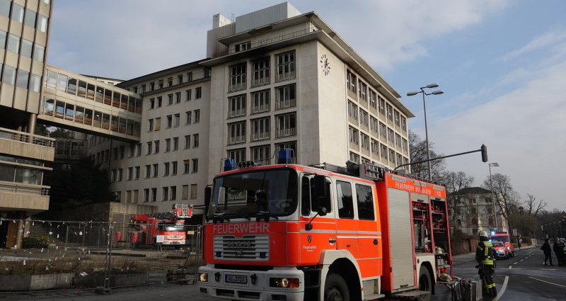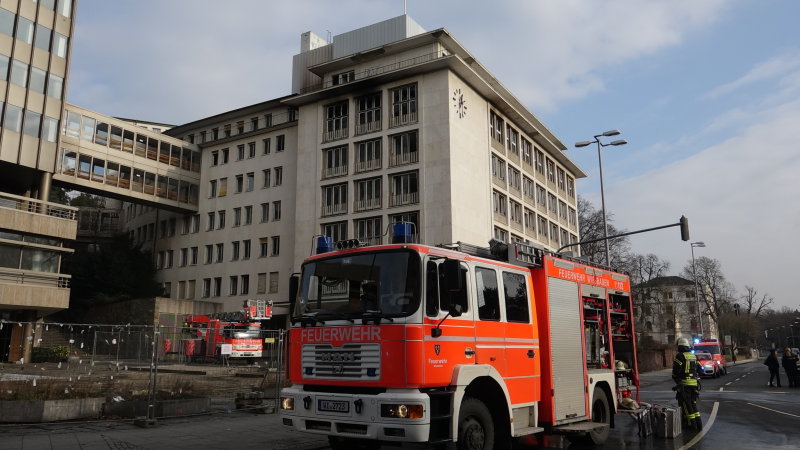 Wiesbaden – Gegen 11:30 Uhr kam es zu einem Brand in einem leerstehenden Nebengebäude des R+V Hochhauses. Aus ungeklärter Ursache kam es zu einem Brand, die Feuerwehr war mit einem Großaufgebot angerückt und löschte den Brand.