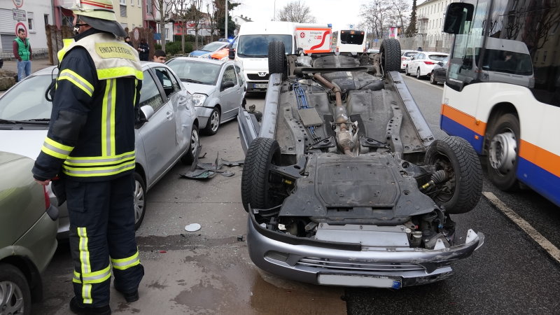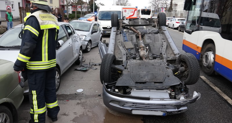 Wiesbaden – Gegen 12:20 kam es zu einem schweren Verkehrsunfall auf der Wiesbadener Straße unweit der Feuerwache 2. Ein PKW prallte gegen zwei weitere PKW, überschlug sich dabei und landete auf dem Dach.