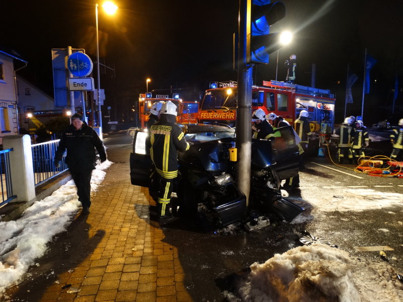Um den schwerverletzten Mann aus seinem Fahrzeug zu befreien musste die Feuerwehr Hessisch Lichtenau mit schwerem Rettungsgerät die Fahrer- und Beifahrertür entfernen. Mit Hilfe von hydraulischen Zylindern wurde eine Rettungsöffnung geschaffen. Mit der maschinellen Zugeinrichtung des Rüstwagens wurde das verkeilte Fahrzeug vom Ampelmast entfernt. Nach 30 Minuten konnte der Fahrer befreit und dem Rettungsdienst übergeben werden. Er wurde nach einer Erstversorgung an der Unfallstelle in ein Krankenhaus eingeliefert. Während des Einsatzes musste die B7 für rund 45 Minuten voll gesperrt werden. Mit Polizei, Notarzt und Feuerwehr waren insgesamt 27 Personen im Einsatz. Wie die Polizei mitteilte wir der Sachschaden auf rund 3000.- Euro geschätzt. Eine Blutprobe wurde von der Staatsanwaltschaft angeordnet.
