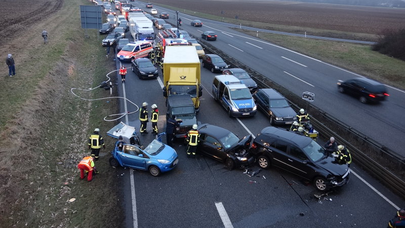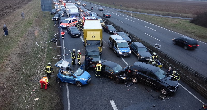 er LKW fuhr zunächst in das Heck eines Fords, an dessen Steuer ein 43-Jähriger aus dem Rheingau-Taunus-Kreis saß. Dieser wurde durch die Wucht des Aufpralls auf den davor stehen Jeep geschoben und in seinem Fahrzeug eingeklemmt. In der weiteren Folge wurde dann der Jeep gegen einen Audi geschoben, dieser wiederum auf einen Mercedes, welcher dann letztendlich den Anhänger eines vor ihm stehenden Transporters beschädigte. Die Fahrer des Mercedes und des Transporters blieben unverletzt. Der LKW-Fahrer und die Jeep-Fahrerin wurden leicht verletzt in ein Krankenhaus eingeliefert. Der Fahrer des Fords wurde durch die Feuerwehr aus seinem Fahrzeug befreit und wie auch die Audi-Fahrerin ebenfalls in ein Krankenhaus eingeliefert. Über die Schwere der Verletzungen des 43 Jährigen ist derzeit unbekannt. Aufgrund der Sperrung der Schiersteiner Brücke wird die B 455 als Hauptverkehrsader genutzt. Der Verkehr auf den Ausweichstrecken, Landstraßen und Autobahn kam teilweise völlig zum erligen. Der Sachschaden wird auf 70.000 Euro geschätzt. Für den Einsatz musste die Bundesstraße zeitweise voll gesperrt werden. Gegen 09.45 Uhr war die Unfallstelle geräumt.