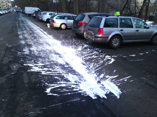 Kassel – Am vergangenen Donnerstag (5 Februar) verunreinigte ein Eimer mit weißer Dispersionsfarbe die Goethestraße in Höhe der Hausnummer 154. Nach der Spurenlage, war der Eimer offenbar von einem Fahrzeug auf die Straße gestürzt.