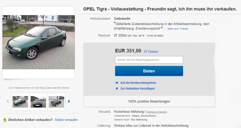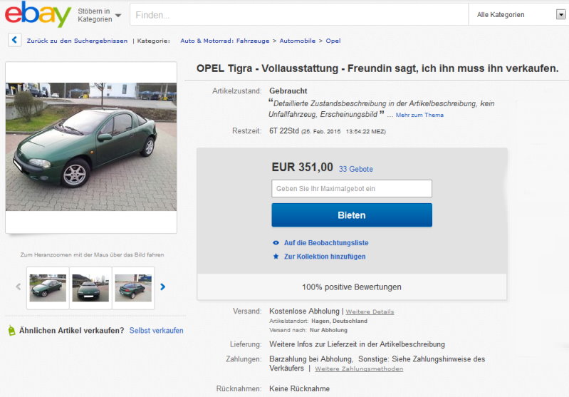Ebay hatte die Anzeige aus den Netz genommen, weil die Anzeige gegen die Ebay-Richtlinien verstoßen würde. Der Fahrzeugbesitzer hat allerdings die Anzeige neu ins Netz eingestellt und derzeit liegt der Preis bei 351 Euro / 6 Tagen. Wer also die ganze Lebensgeschichte lesen will oder sogar das Fahrzeug aus Hage/NRW kaufen will, kann jetzt hier auf den Link klicken.
