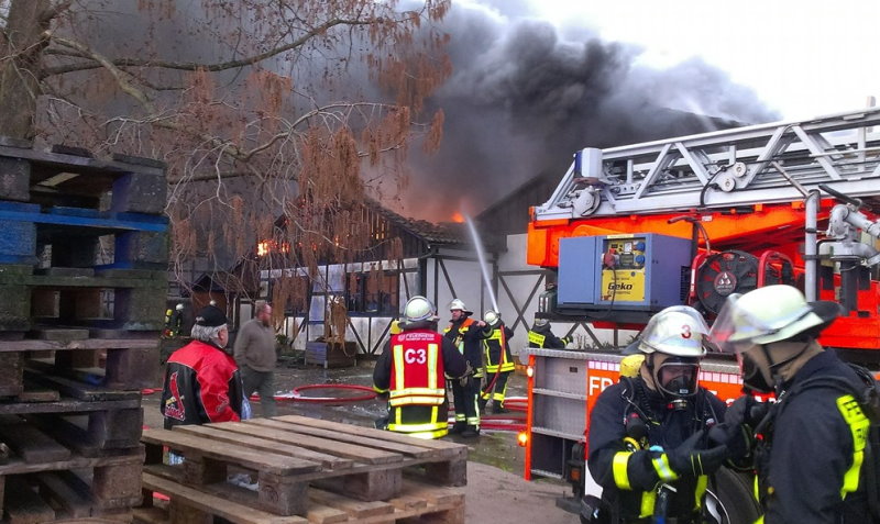 Außerdem hatte sich das Feuer bereits auf die Dachflächen zweier angrenzender Wirtschaftsgebäude ausgebreitet. Durch den Einsatz von insgesamt sechs Rohren und einem Wenderohr über eine Drehleiter, welche von Trupps unter Atemschutz eingesetzt wurden, konnte eine weitere Ausbreitung des Brandes verhindert und die benachbarten Gebäudeteile weitestgehend geschützt und somit erhalten werden. Da die Dachfläche eines der vom Brand betroffenen Gebäude einsturzgefährdet war, kam zur Unterstützung bei den Nachlöscharbeiten noch ein Gelenkmast der Werkfeuerwehr Infraserv zum Einsatz. Es entstand ein Sachschaden von rund 250.000 Euro. Eine Person wurde vor Ort mit Verdacht auf eine Rauchvergiftung vom Notarzt behandelt. Die Berufsfeuerwehr, die Freiwilligen Feuerwehren aus Unterliederbach, Höchst, Rödelheim und Zeilsheim, der Rettungsdienst sowie die Werkfeuerwehr Infraserv waren mit insgesamt 17 Fahrzeugen und 55 Einsatzkräften vor Ort.