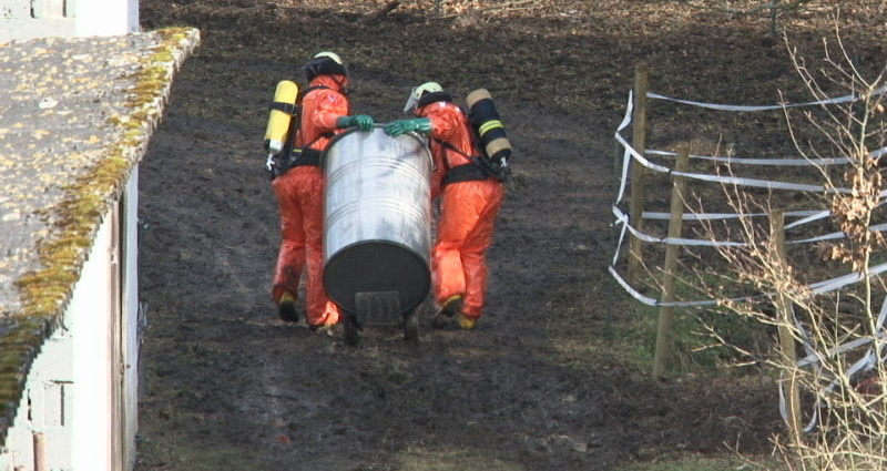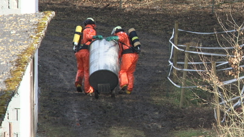 Die Neubesitzer die das Gebäude an der B251 gekauft haben, stießen bei Zaunarbeiten für eine Pferdekoppel auf das Metallfass, was nur wenige Zentimeter im Boden eingegraben war. Das etwa 100 Liter fassende Behältnis war stark verrostet. Aus Sorge, ein Pferd könnte sich daran verletzen, entschlossen sich die Hofbewirtschafter das Fass auszugraben. Dabei öffnete sich die Tonne und übel riechende Dämpfe drangen in die Luft. Da nicht auszuschließen war, dass die stark ätzend riechende Flüssigkeit gesundheitsgefährdend sein könnte, informierte man den Rettungsdienst.