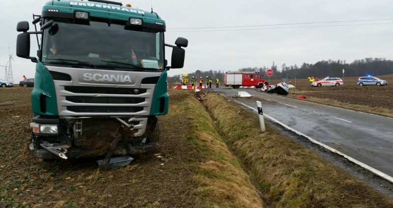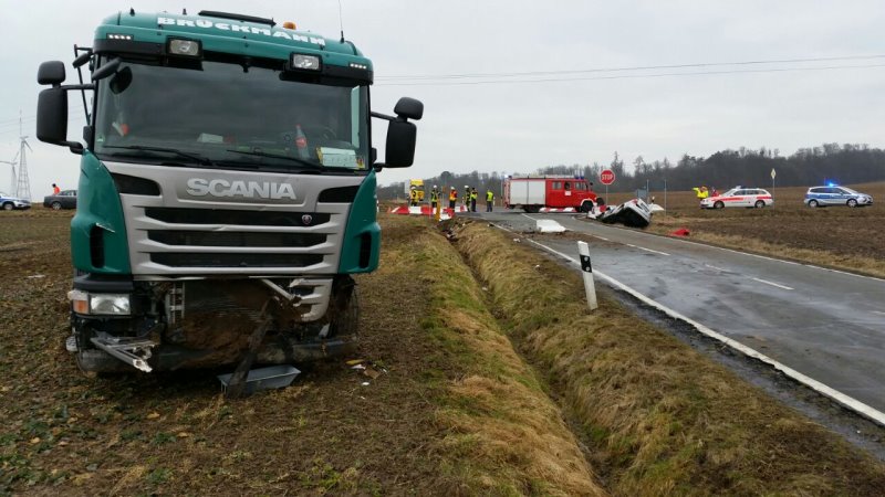 Ein LKW Fahrer übersah vermutlich das an der Kreuzung stehende Stoppschild und krachte in die Seite des PKW. Das Fahrzeug wurde in einen Graben geschleudert und blieb vor einem Wasserdurchlauf stehen. Der Fahrer wurde in seinem Fahrzeug eingeklemmt und musste von der Feuerwehr befreit werden. Nach einer Erstversorgung an der Unfallstelle wurde der schwer verletzte Fahrer mit dem Rettungshubschrauber Christoph 44 in ein Krankenhaus geflogen. Der LKW durchfuhr noch den Kreuzungsbereich und kam dann auf einem Feld zum stehen. Der Fahrer wurde bei dem Unfall ebenfalls verletzt und musste in ein Krankenhaus eingeliefert werden. Um die genaue Unfallursache klären zu können, wurde ein Gutachter zur Unfallstelle bestellt. Während des gesamten Einsatzes musste die Strasse voll gesperrt werden.
