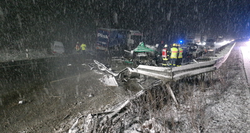 Beide Fahrzeuge durchbrachen bei Kilometer 295 die Mittelleitblanke, gerieten in den Gegenverkehr und krachten dort mit zwei weiteren Fahrzeugen zusammen. Insgesamt wurden bei dem Unfall sechs Menschen zum Teil schwer verletzt. Zwei Personen wurden im Fahrzeug eingeklemmt und mussten von der Feuerwehr befreit werden. Für einen 48-jährigen Mann kam jedoch jede Hilfe zu spät er verstarb noch an der Unfallstelle. Wie Einsatzleiter Dieter Röthig gegenüber Hessennews mitteilte, bot sich als erstes Bild eine eher undurchsichtige Lage. Die teilweise chaotischen Wetterbedingungen erschwerten die Arbeit der Einsatzkräfte ebenfalls. Die Fahrbahnen in Richtung Norden und Süden mussten komplett auf Grund der Unfallaufnahme komplett gesperrt werden. Um den genauen Hergang des Unfalls rekonstruieren zu können, wurde ein Gutachter zur Unfallstelle bestellt. Durch die sehr aufwendigen Bergungsarbeiten zog sich die Freigabe der Autobahn über Stunden hin. Die Autobahnmeisterei war ebenfalls im Einsatz und sorgte dafür, dass die Fahrspuren auch weiterhin von Schnee und Eis frei blieben. Auf Grund der langen Wartezeiten wurde die SEG (Schnelleinsatzgruppe) zur Einsatzstelle gerufen, um die Wartenden mit heißen Getränken und Decken zu versorgen. Auf Grund des schweren Unfalls staute sich der Verkehr bis zum Rasthof Kassel. Auch die Umleitungsstrecken waren teilweise hoffnungslos überlastet. Zum Einsatz kamen neben der Feuerwehr Hann. Münden auch das THW zum Ausleuchten der Einsatzstelle, sowie die Rettungshubschrauber Christoph 7 aus Kassel sowie Christoph 44 aus Göttingen.